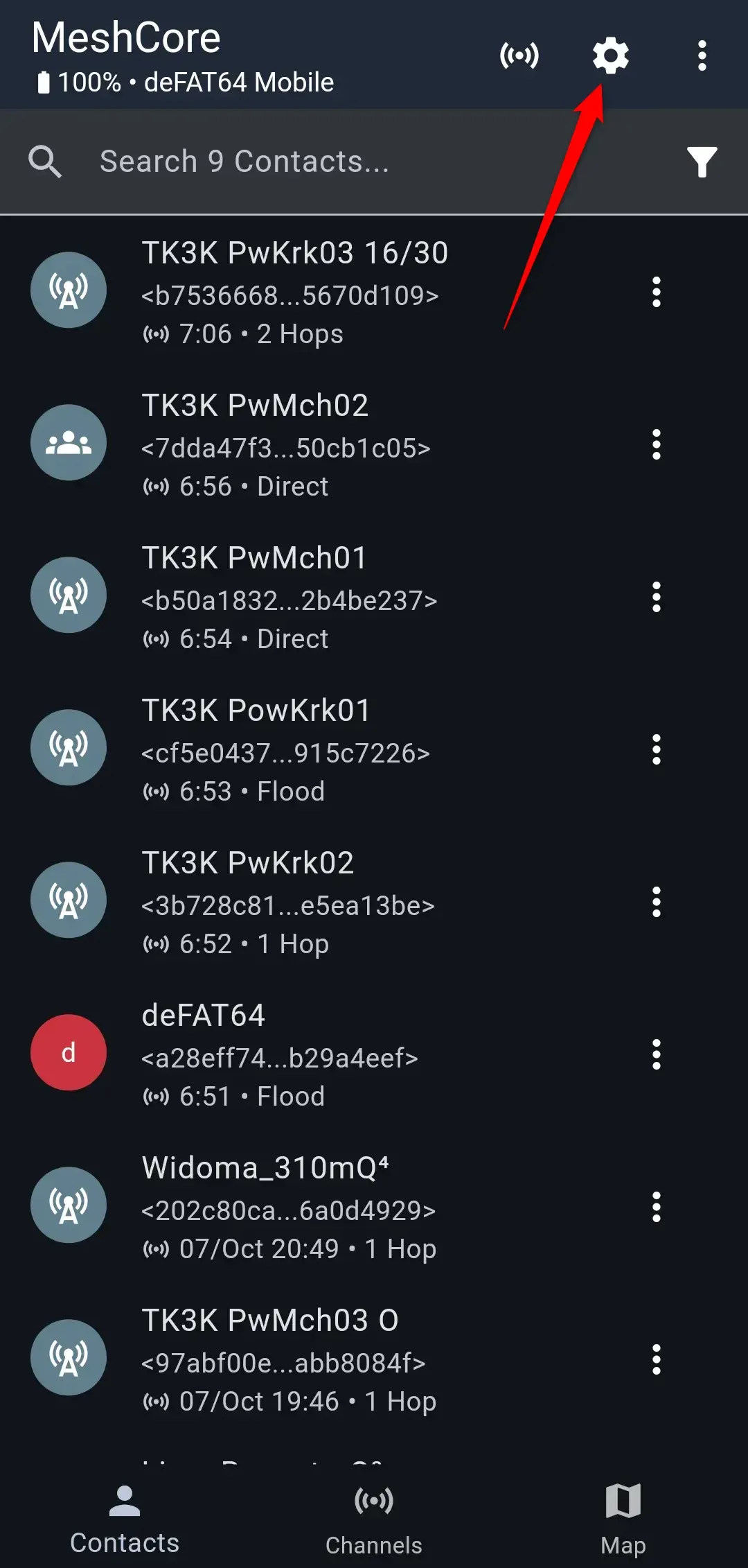 Uruchom aplikację MeshCore i wybierz ikonę koła zębatego.