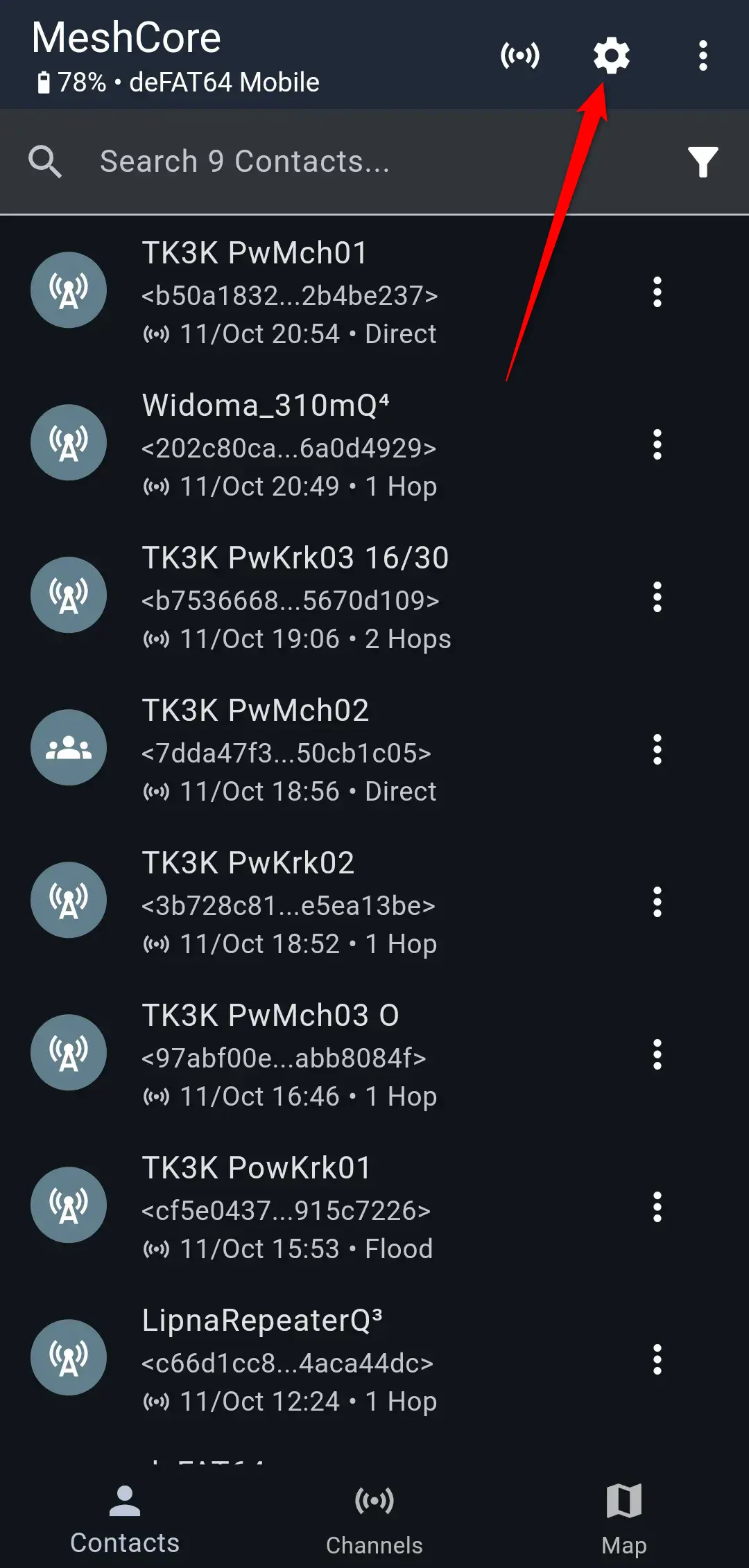 Po uruchomieniu na telefonie aplikacji MeshCore kliknij ikonę koła zębatego.