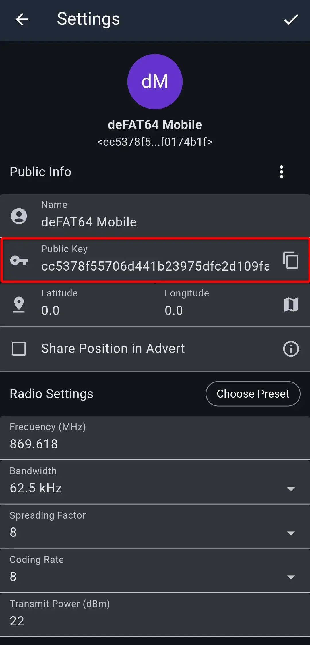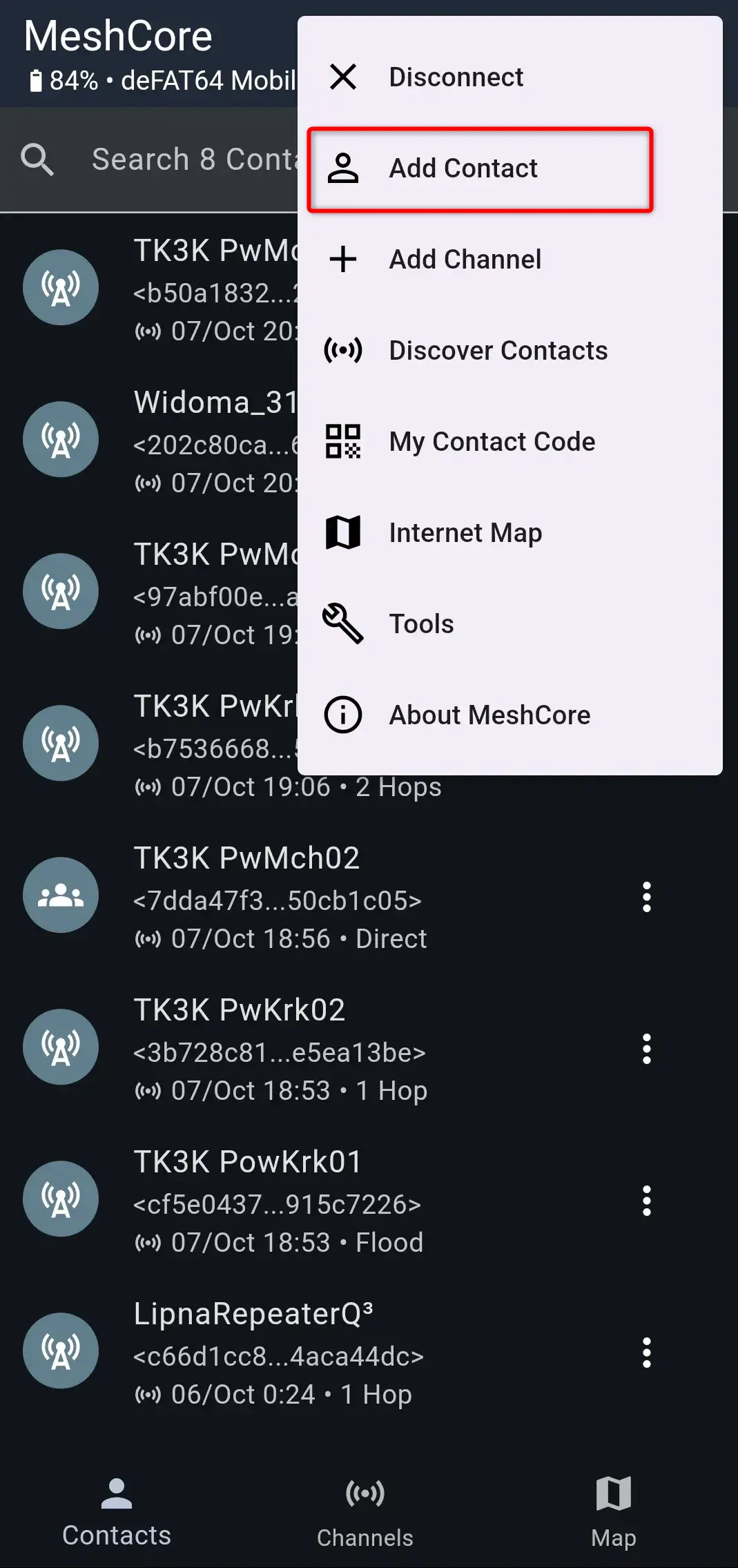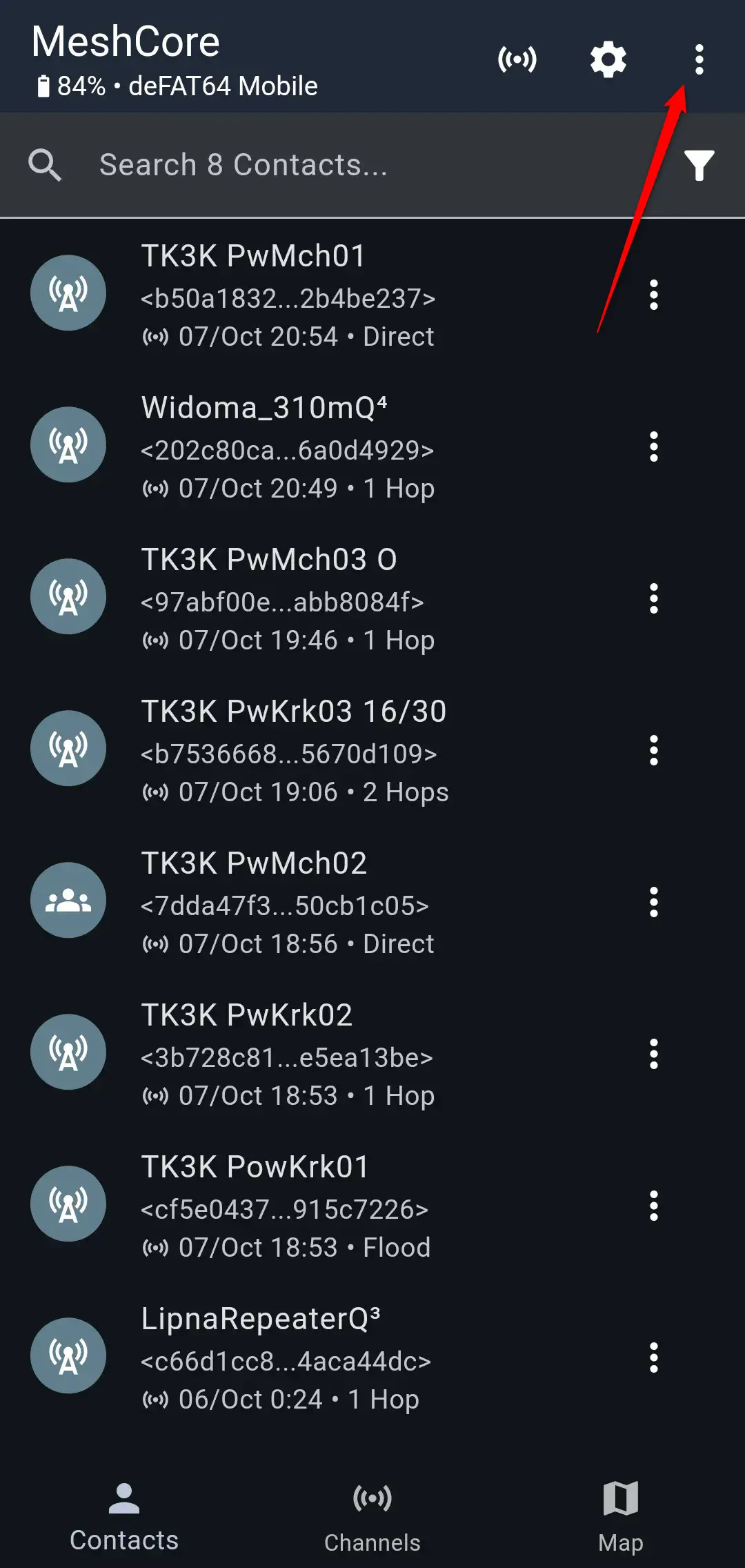 Uruchom aplikację MeshCore, kliknij ikonę trzech kropek w prawym, górnym rogu...