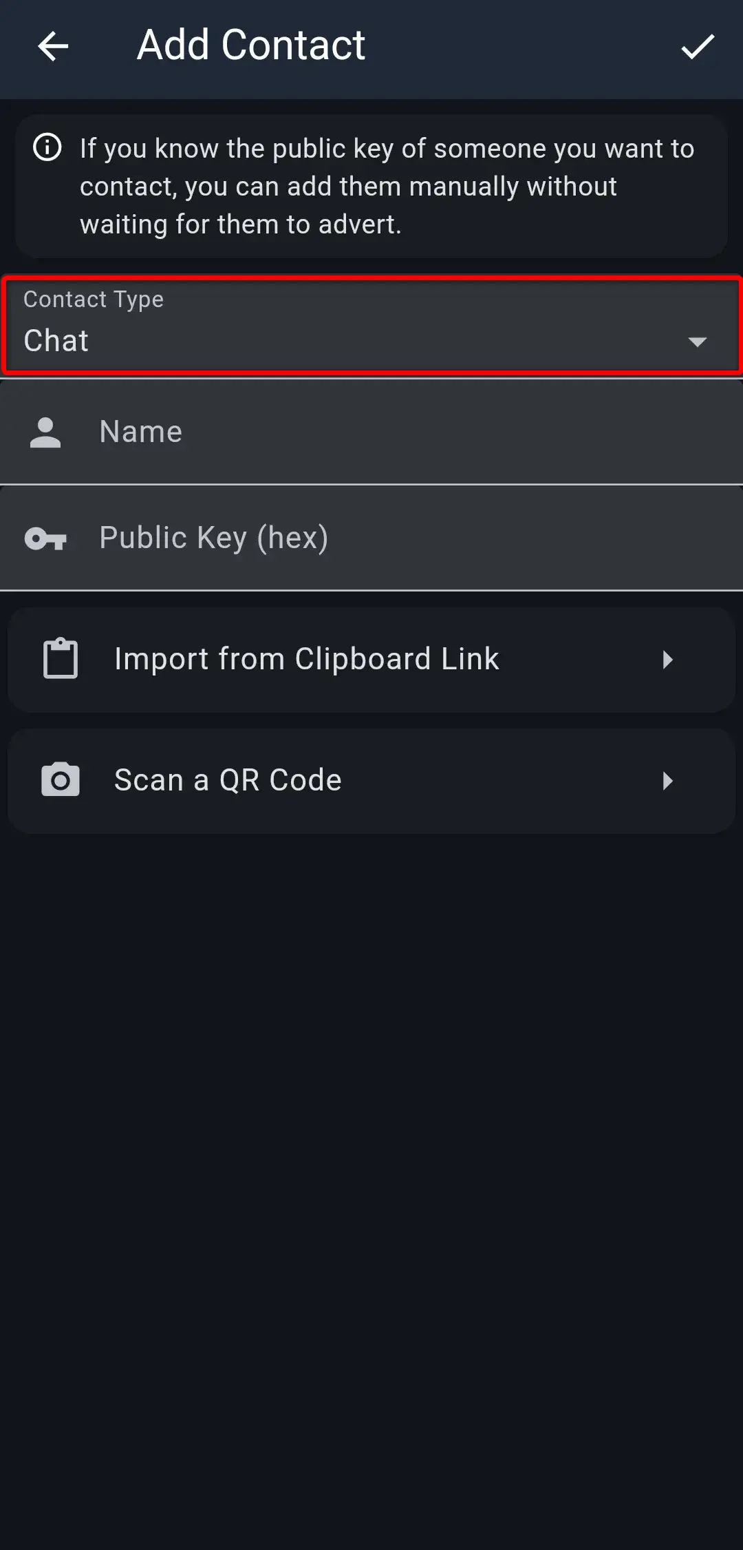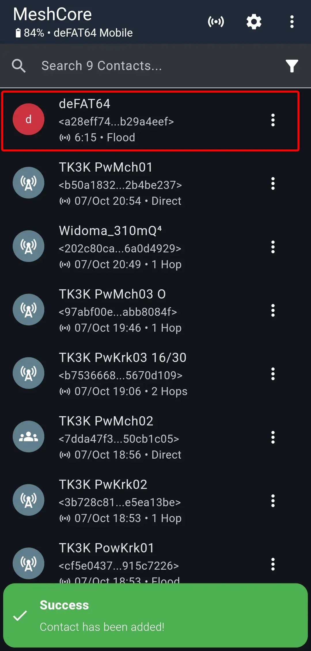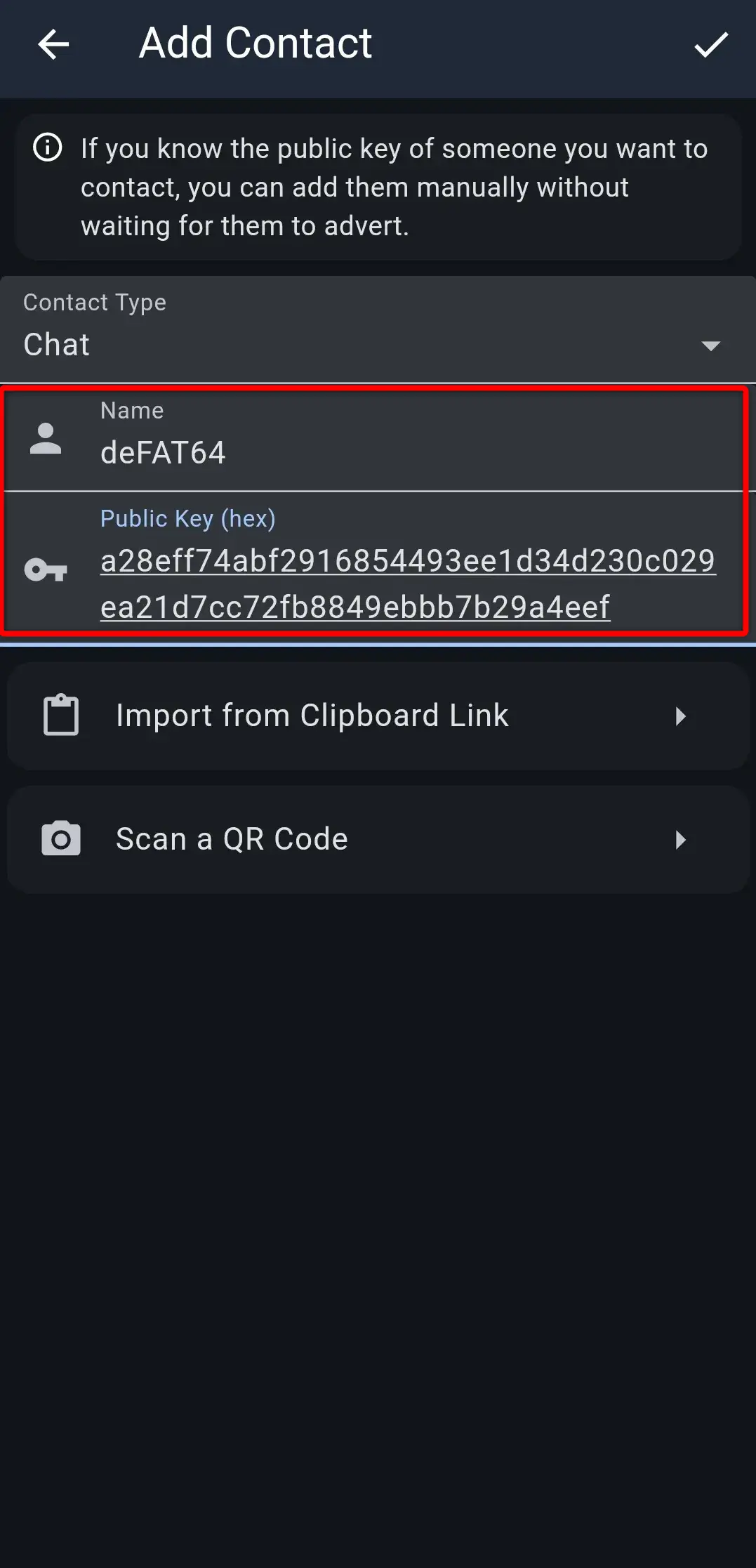 Aby dodać kontakt, musisz posiadać klucz publiczny danej osoby lub stacji. Klucz publiczny to długi ciąg liter oraz cyfr. Przykład: