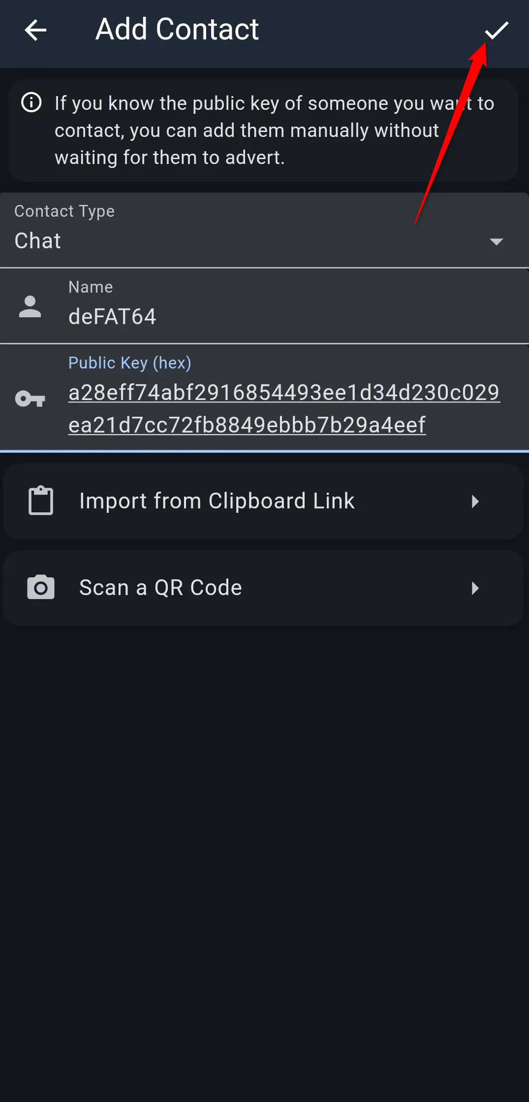 W polu Name wpisz nazwę kontaktu, zaś do pola Public key (hex) wklej klucz publiczny kontaktu, który chcesz dodać.
