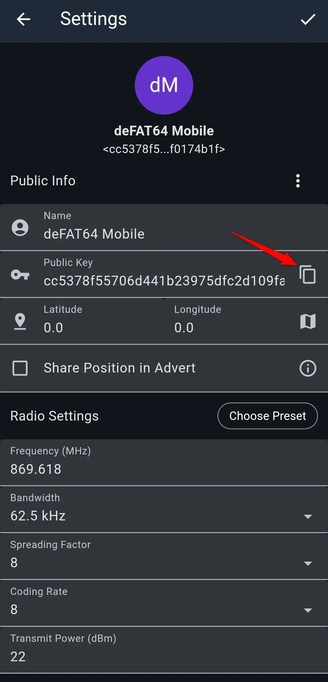 Kliknij ikonę kopiowania po prawej stronie, aby skopiować klucz publiczny.