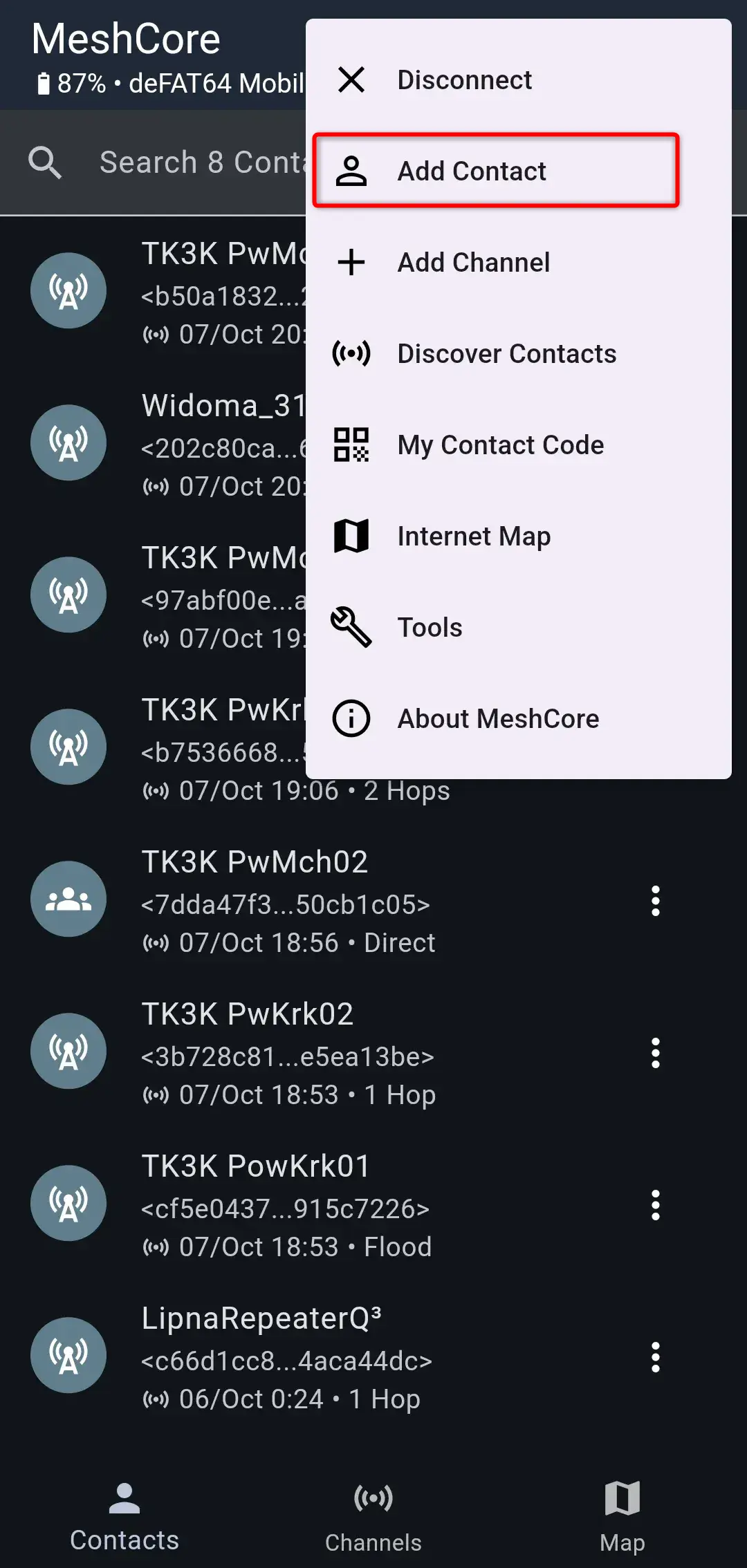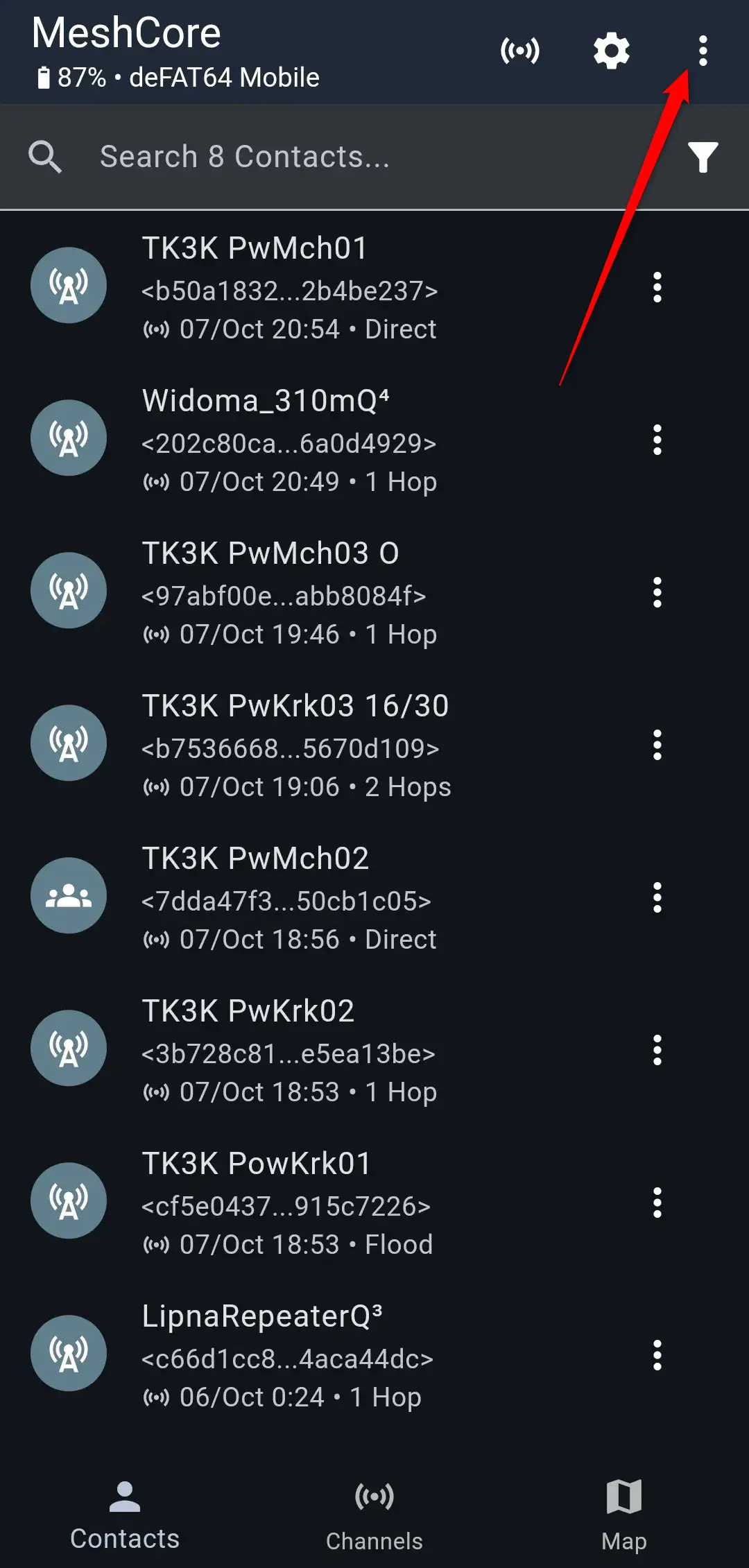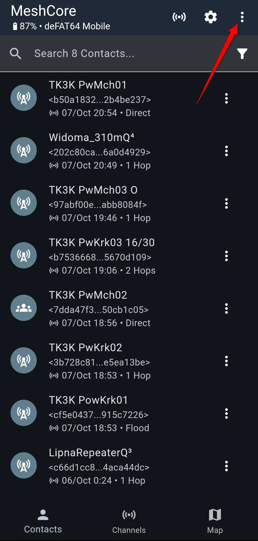 Uruchom aplikację MeshCore, kliknij na ikonę trzech kropek...