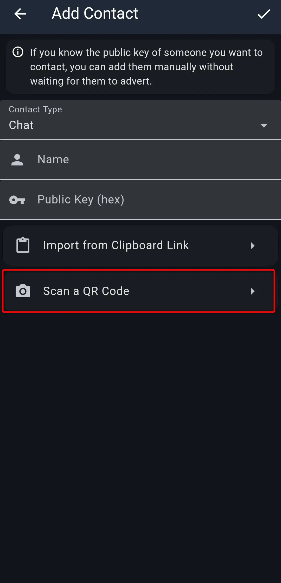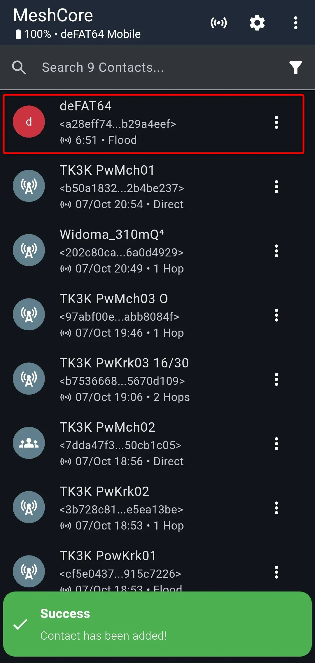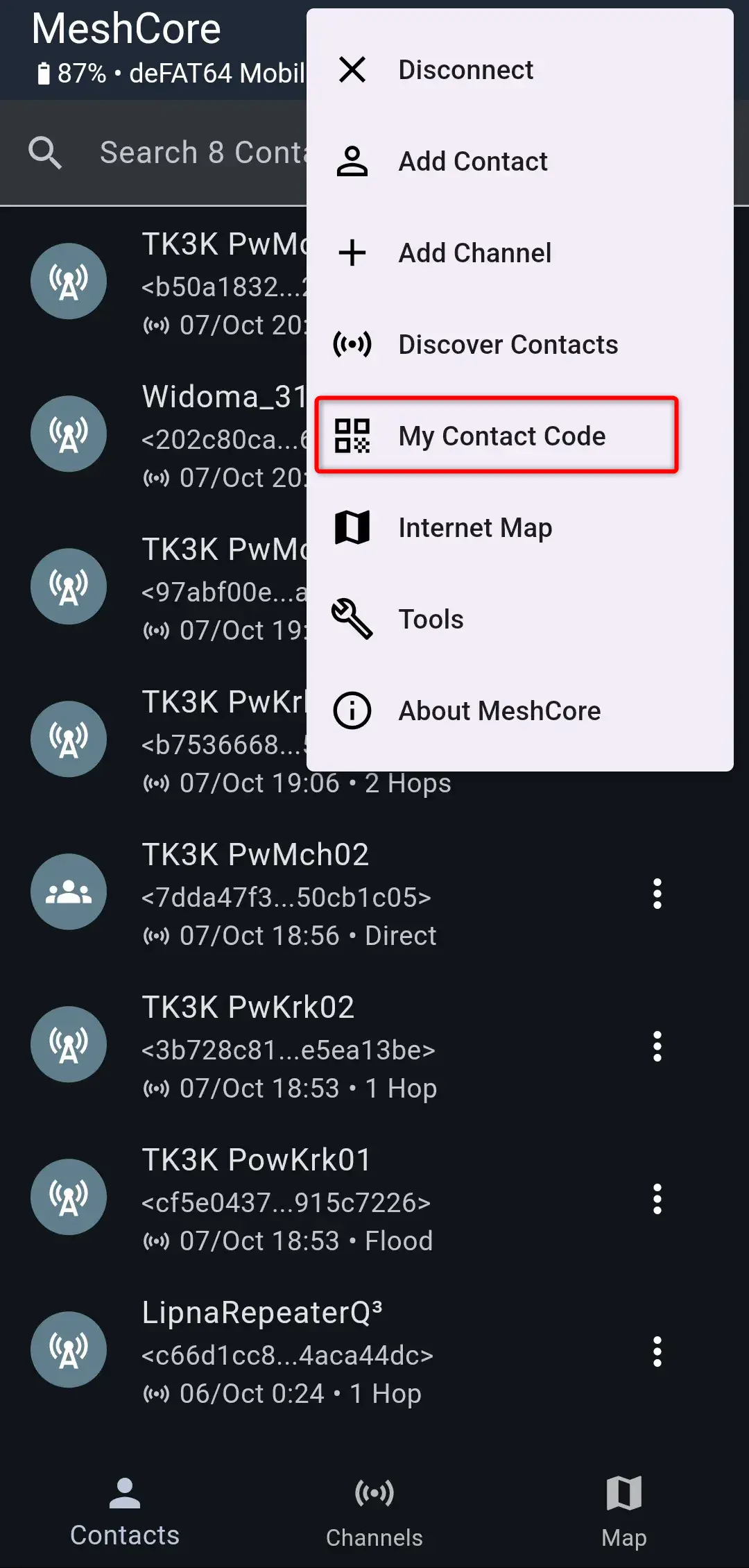 Uruchom aplikację MeshCore, kliknij na ikonę trzech kropek...