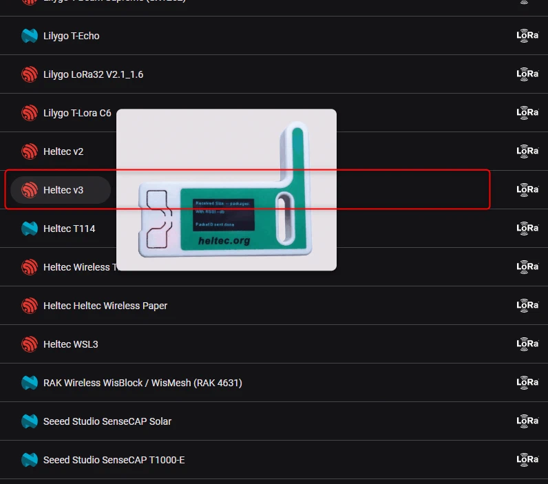 Wybierz z listy urządzenie. W tym poradniku wykorzystano Heltec V3.