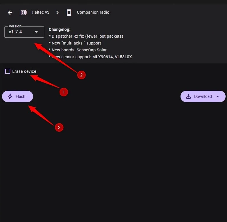 W następnym oknie zaznacz Erase device. Ta opcja robi swego rodzaju formatowanie, czyli skasuje wszystkie dane na płytce. Upewnij się również, czy wybrana jest najnowsza wersja oprogramowania. Kliknij na przycisk Flash.