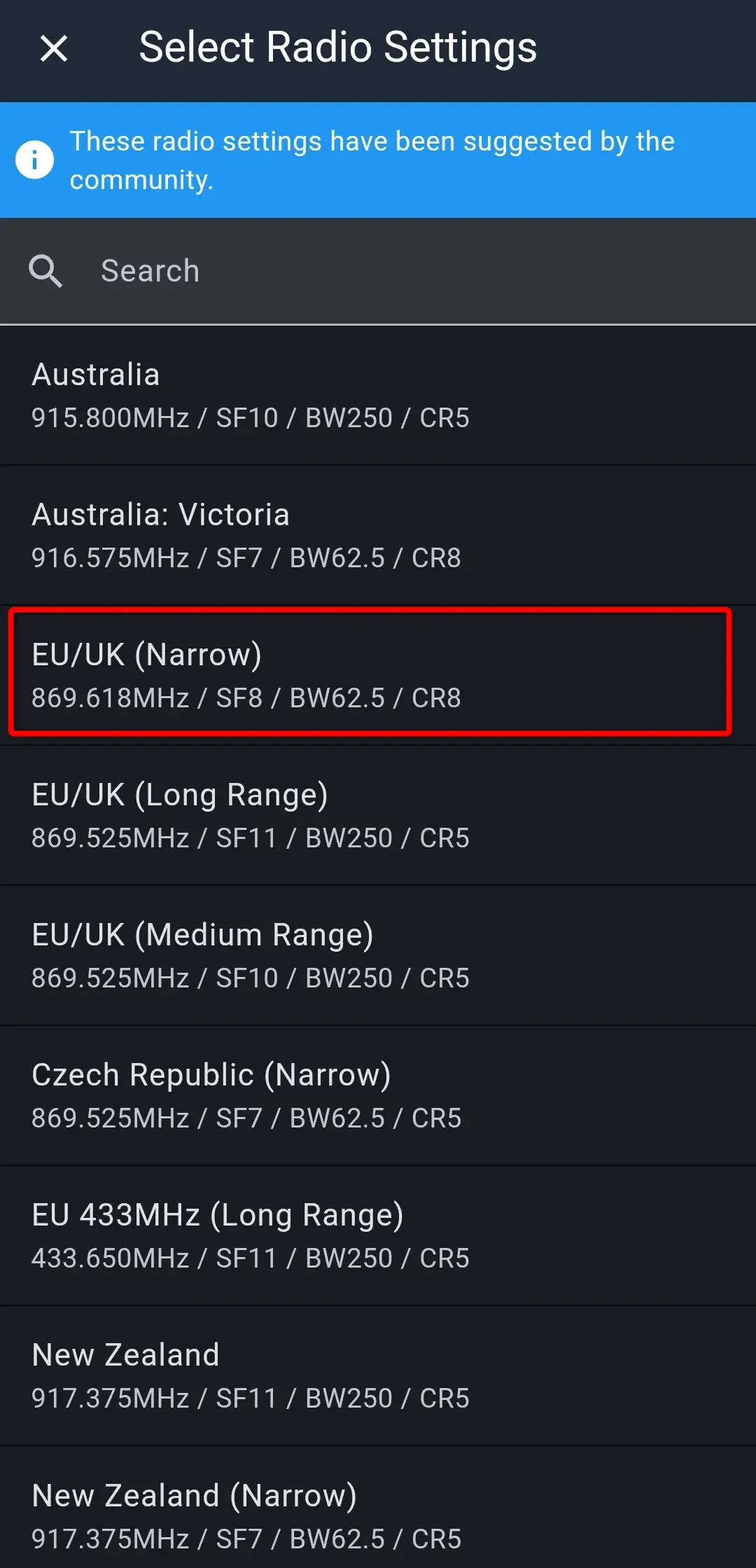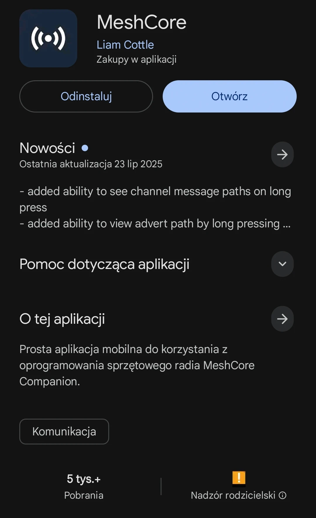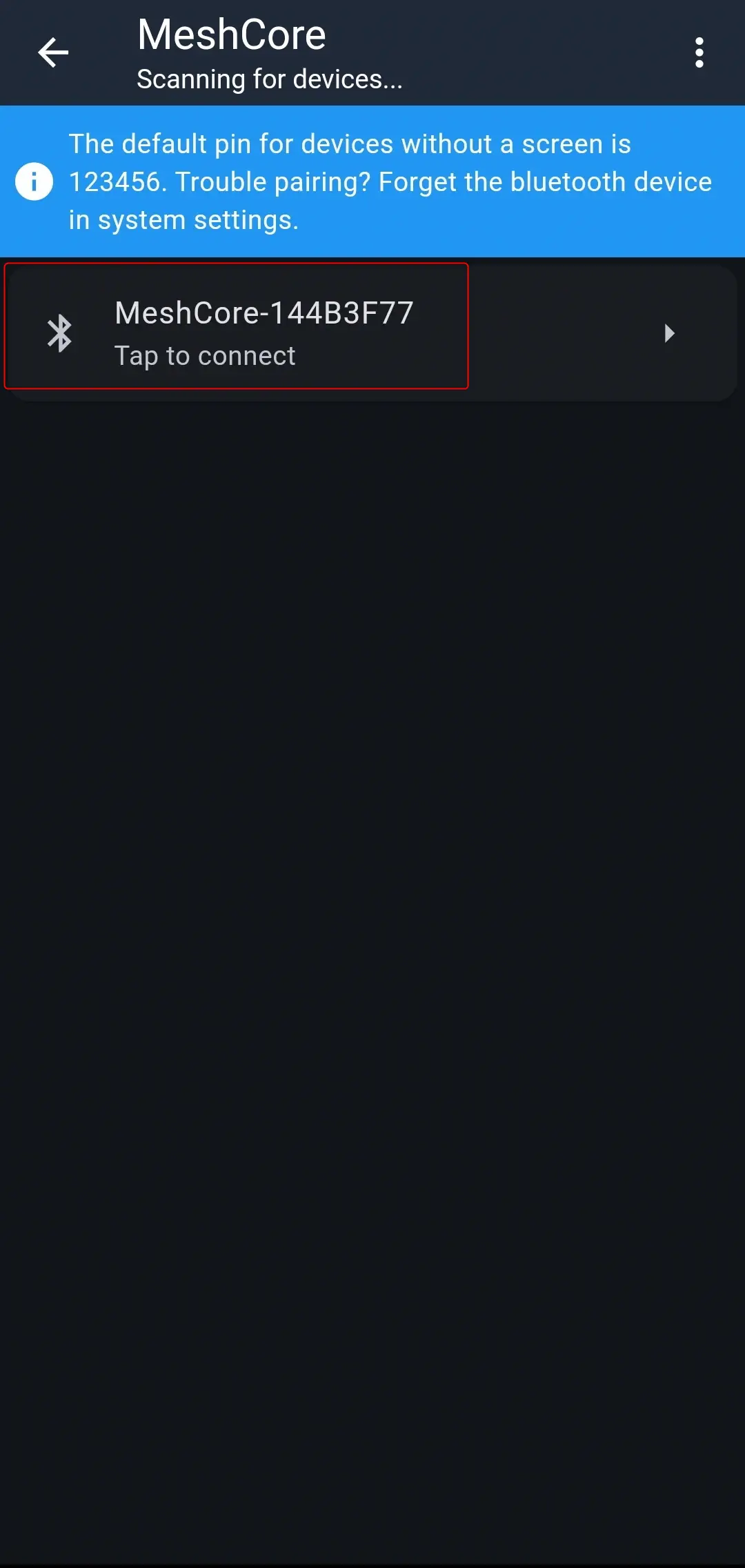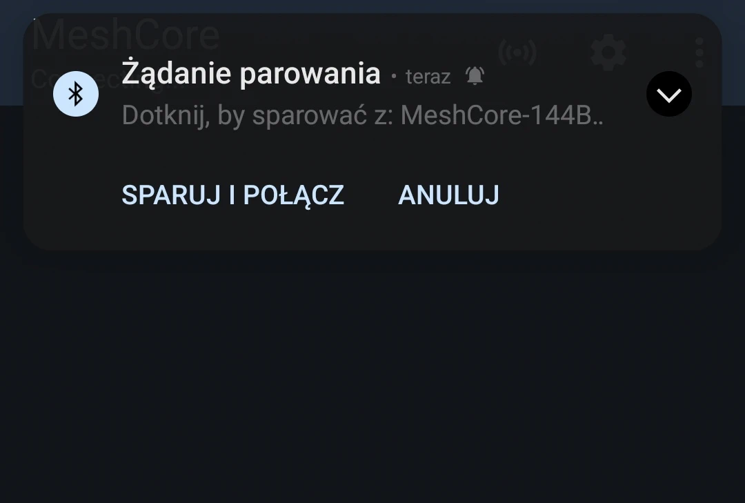 Nie paruj telefonu z płytką przy pomocy parowania Bluetooth wbudowanego w system Android, gdyż tak sparowane urządzenie nie połączy się z programem MeshCore. Paruj zawsze przy pomocy aplikacji.
