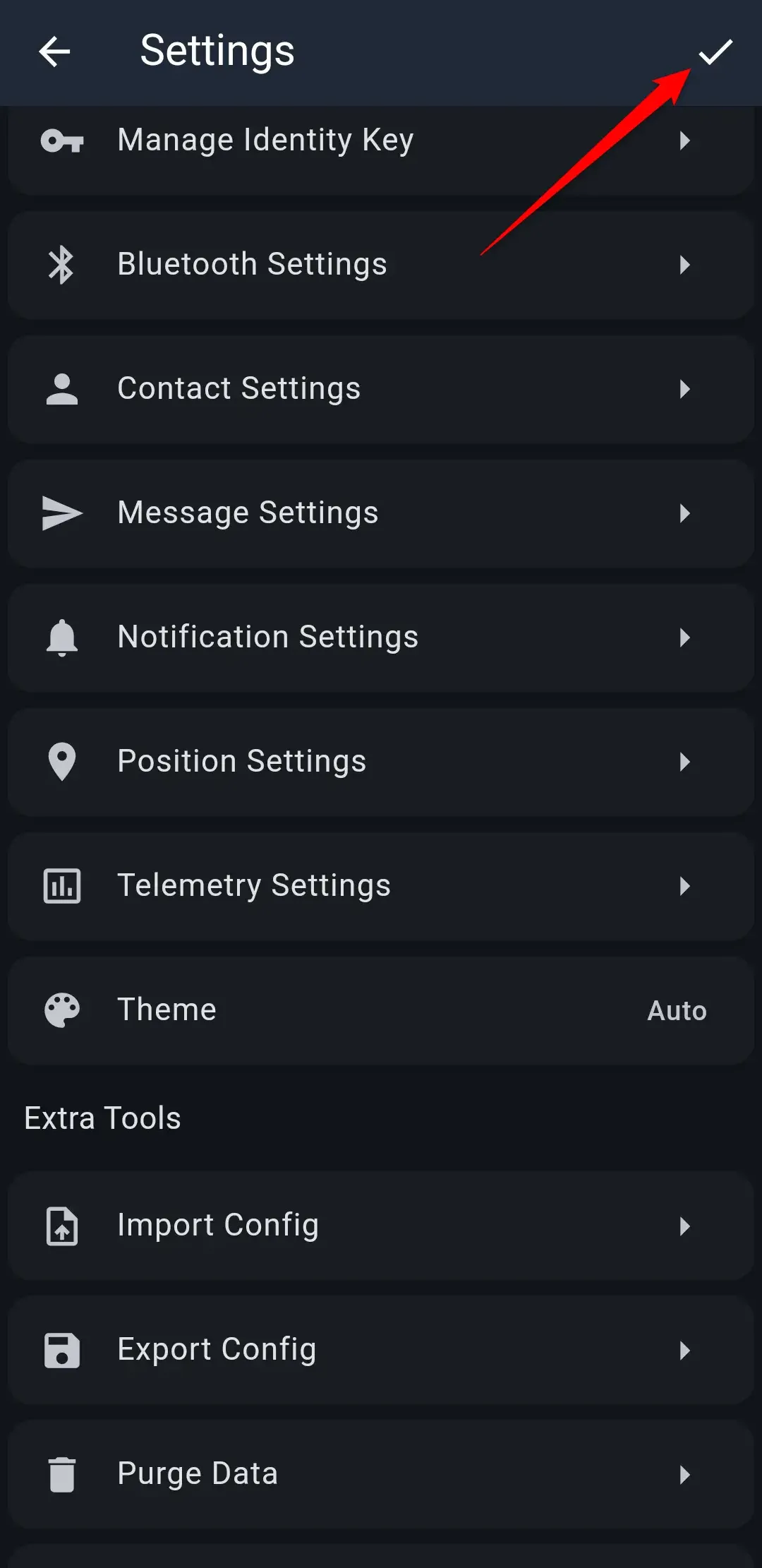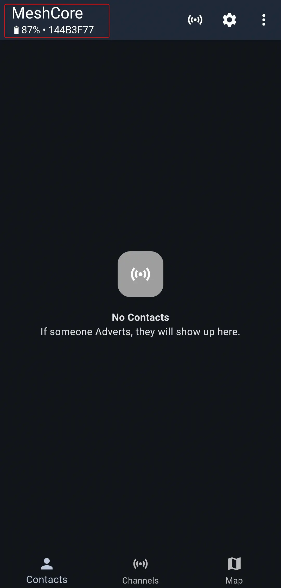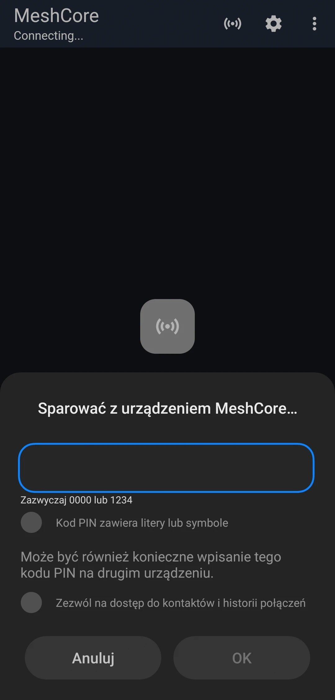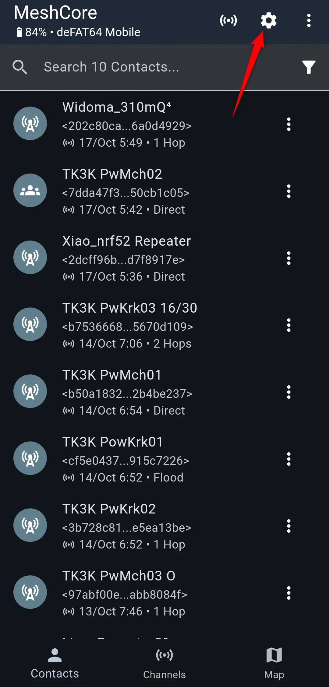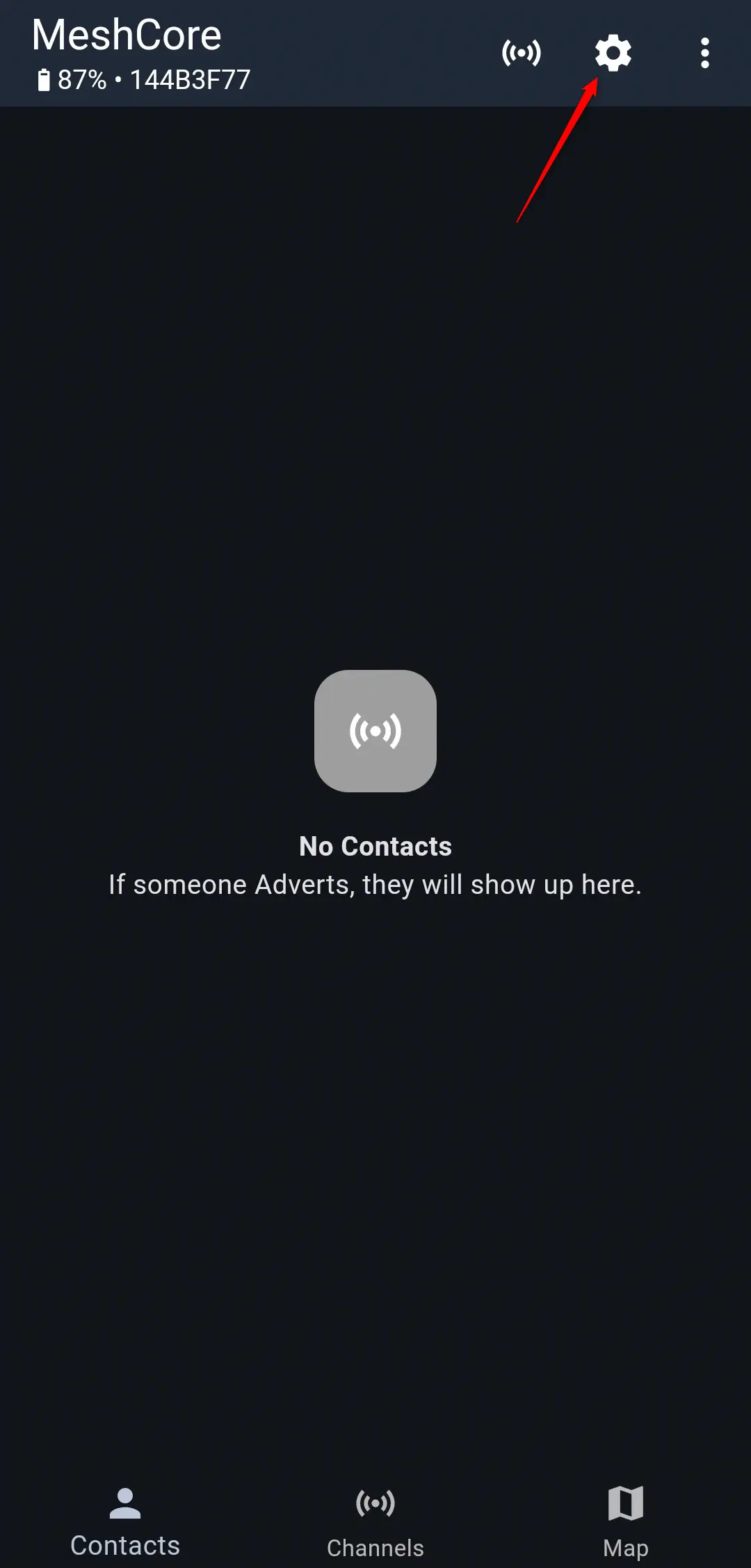 W aplikacji MeshCore kliknij na ikonę koła zębatego.