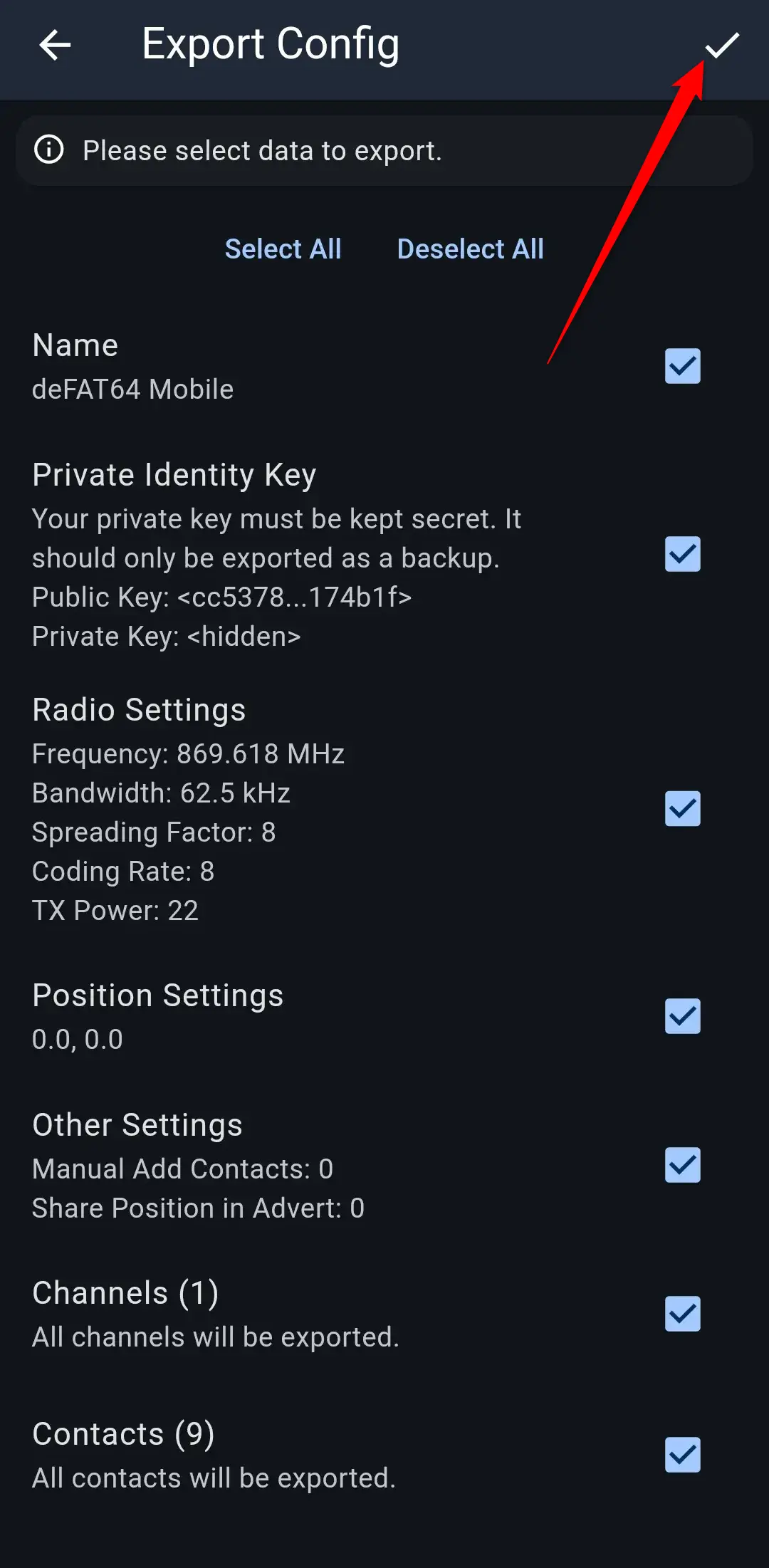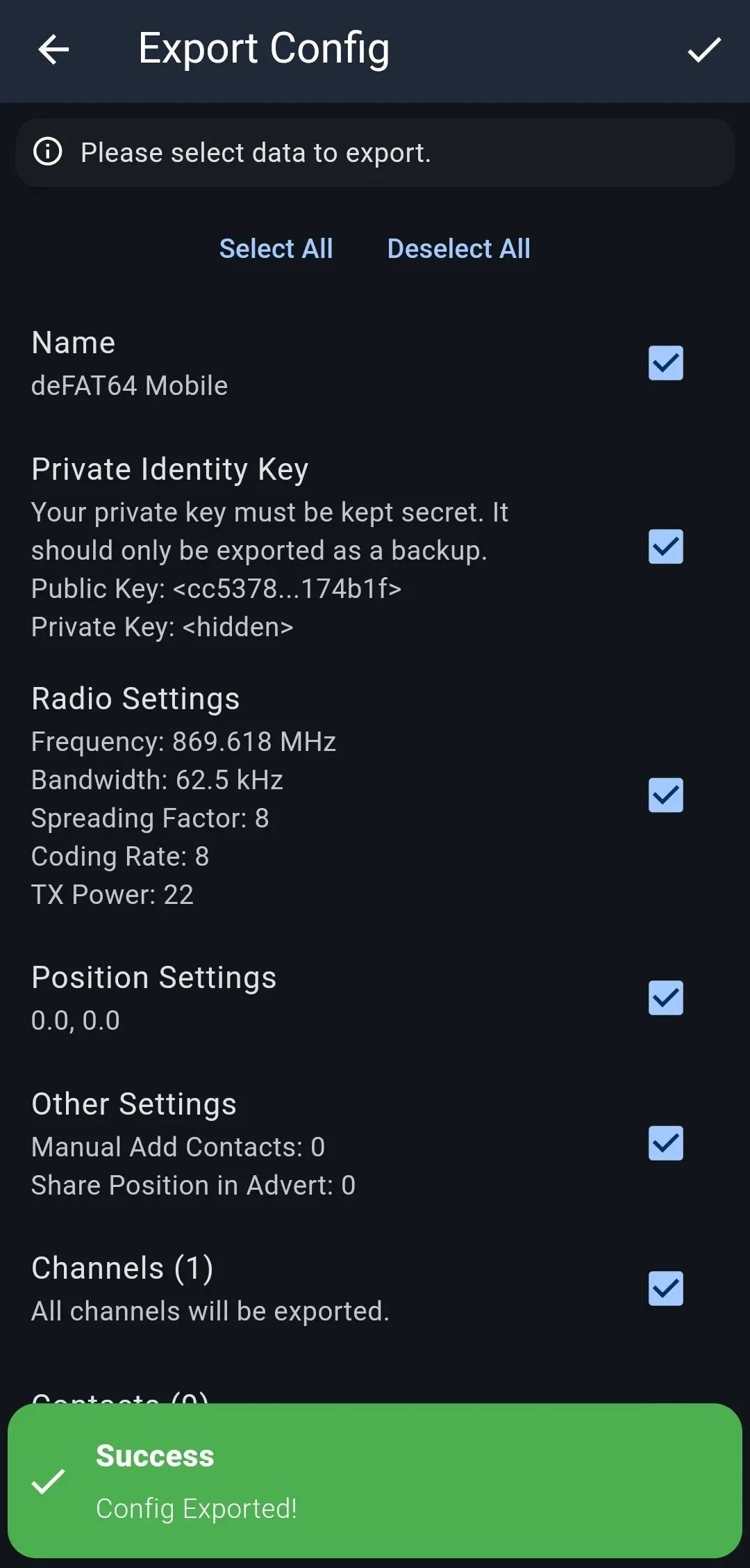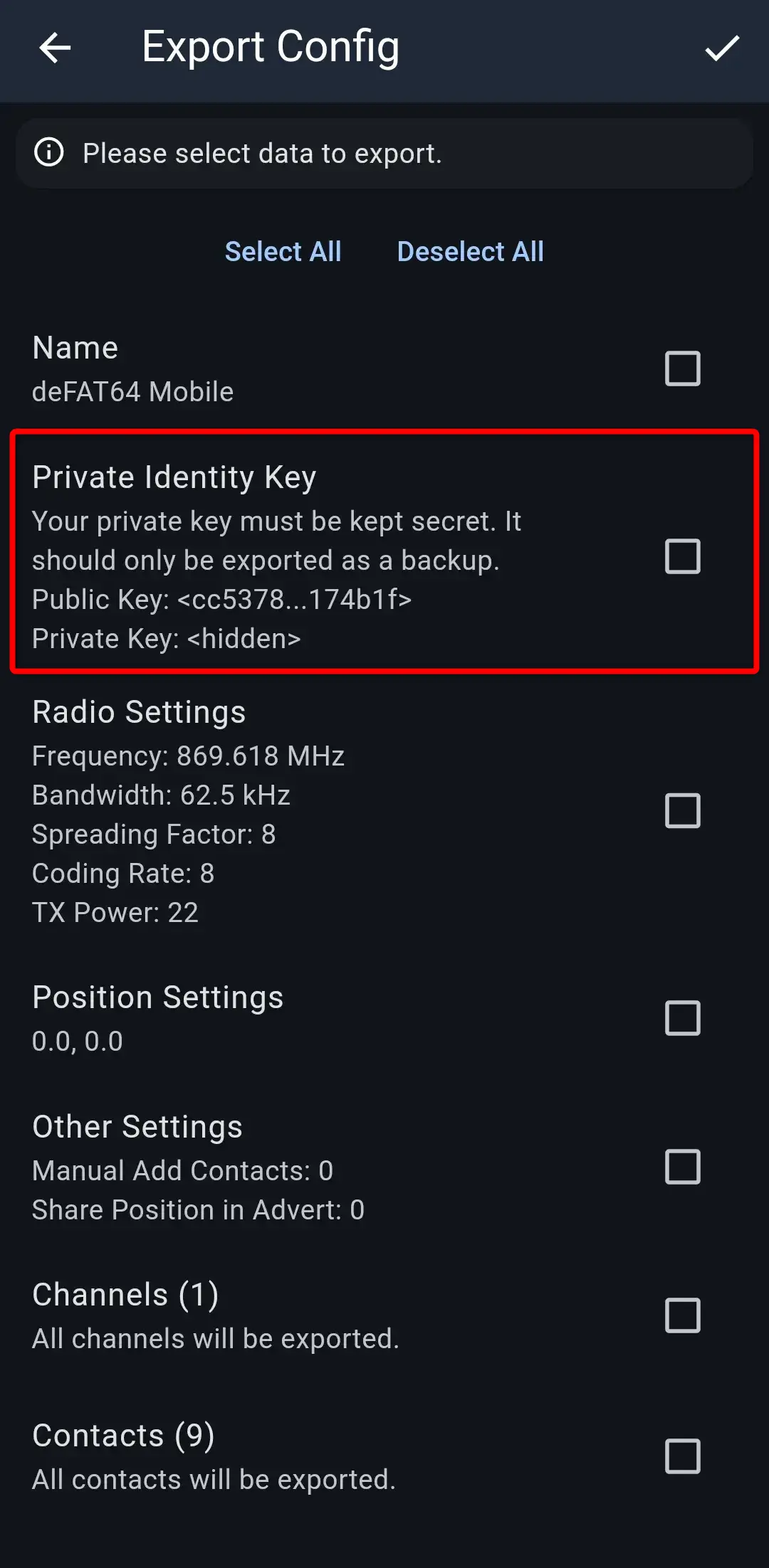 Pojawią się elementy, których kopię możesz wykonać. Najważniejszy dla Ciebie jest klucz publiczny i skojarzony z nim klucz prywatny. Te dane są generowane podczas instalacji oprogramowania na płytce i w przypadku reinstalacji softu zostanie wygenerowana nowa para klucz. Co to oznacza? Dla sieci LoRa będziesz widniał jako nowy użytkownik i wszystkim znajomym, z którymi utrzymujesz kontakt będziesz musiał wysłać nowy klucz publiczny. Stare dane zostaną bezpowrotnie utracone. Z tego powodu opcję Private Identity Key zaznacz obowiązkowo.