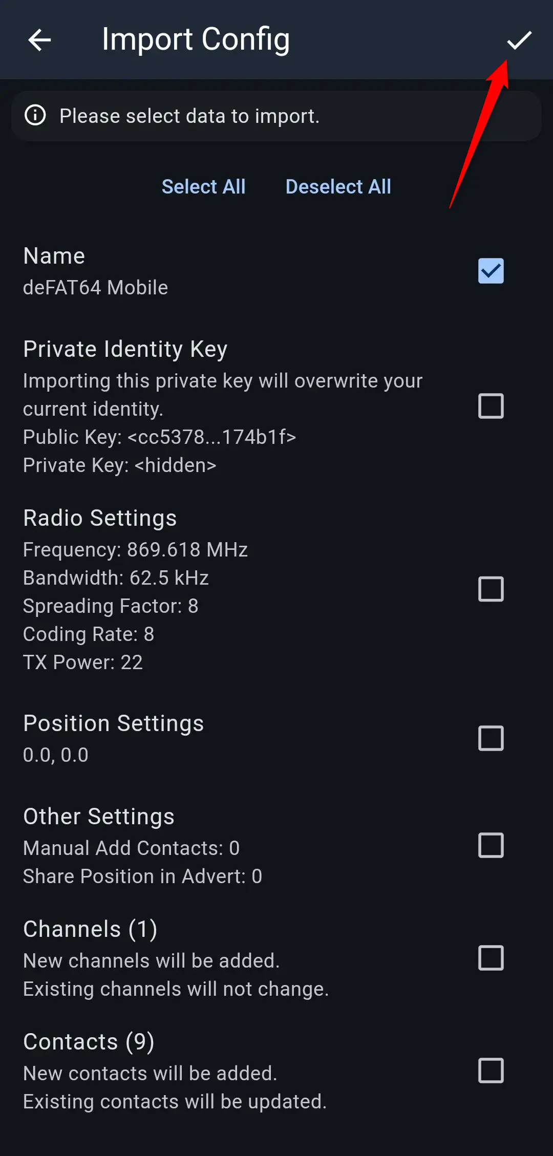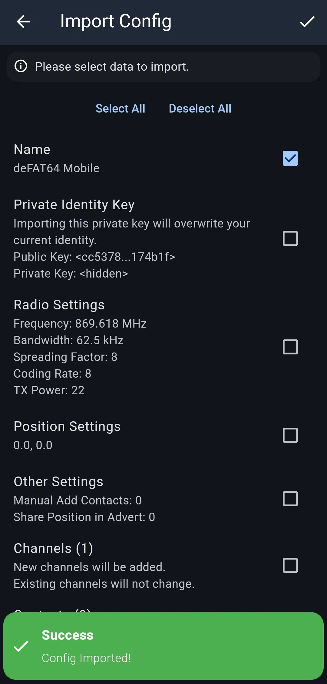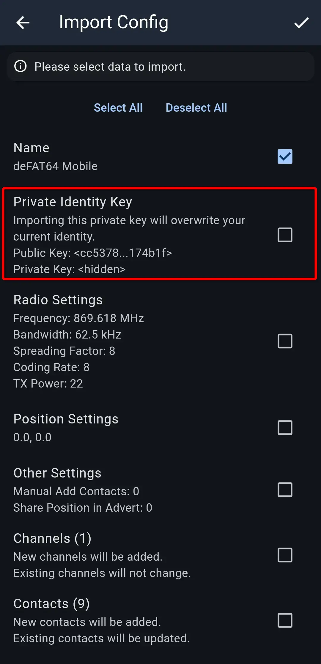Pojawią się elementy, których kopię możesz wykonać. Najważniejszy dla Ciebie jest klucz publiczny i skojarzony z nim klucz prywatny. Te dane są generowane podczas instalacji oprogramowania na płytce i w przypadku reinstalacji softu zostanie wygenerowana nowa para klucz. Co to oznacza? Dla sieci LoRa będziesz widniał jako nowy użytkownik i wszystkim znajomym, z którymi utrzymujesz kontakt będziesz musiał wysłać nowy klucz publiczny. Stare dane zostaną bezpowrotnie utracone. Z tego powodu opcję Private Identity Key zaznacz obowiązkowo.