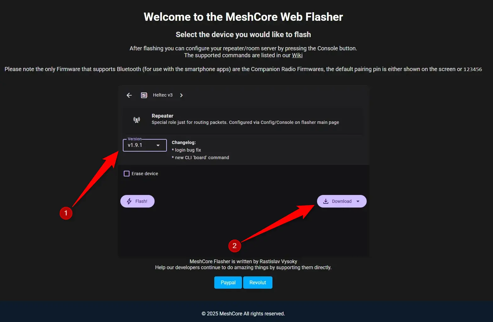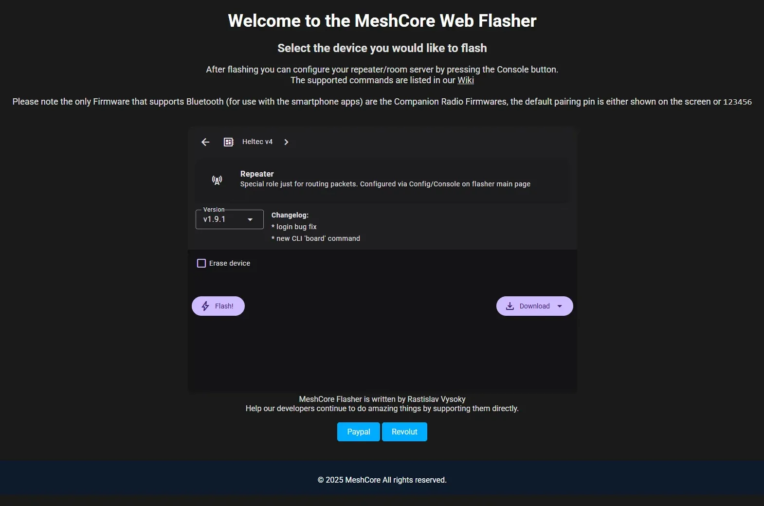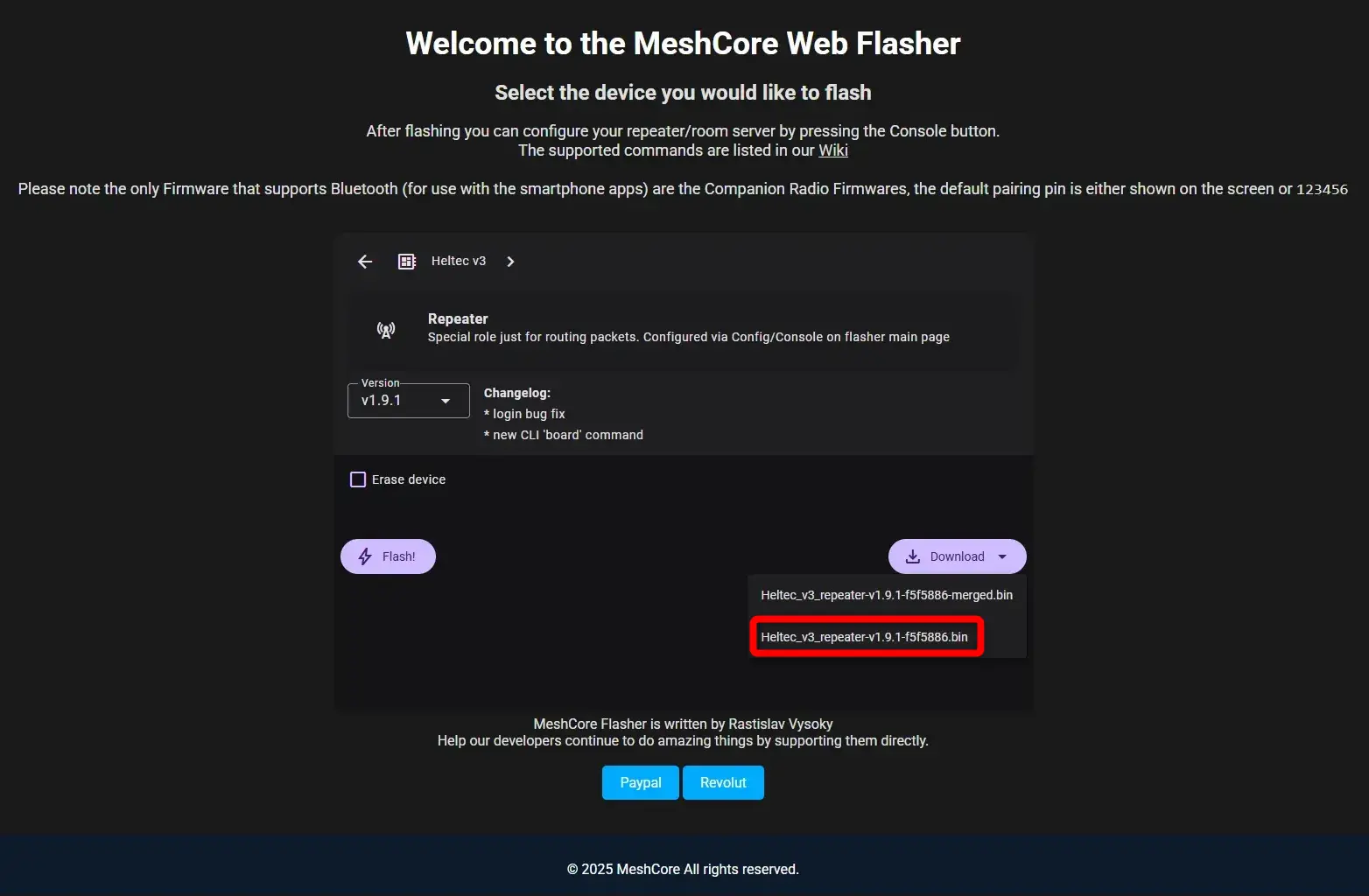 Wejdź na stronę Web Flasher MeshCore, odszukaj płytkę Heltec V3, następnie wybierz rolę Repeater lub Room server. Dojdziesz do takiego ekranu.