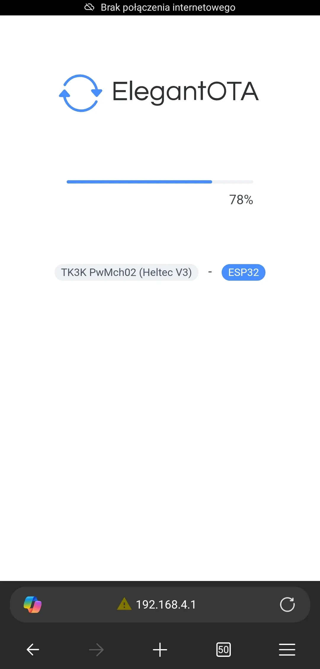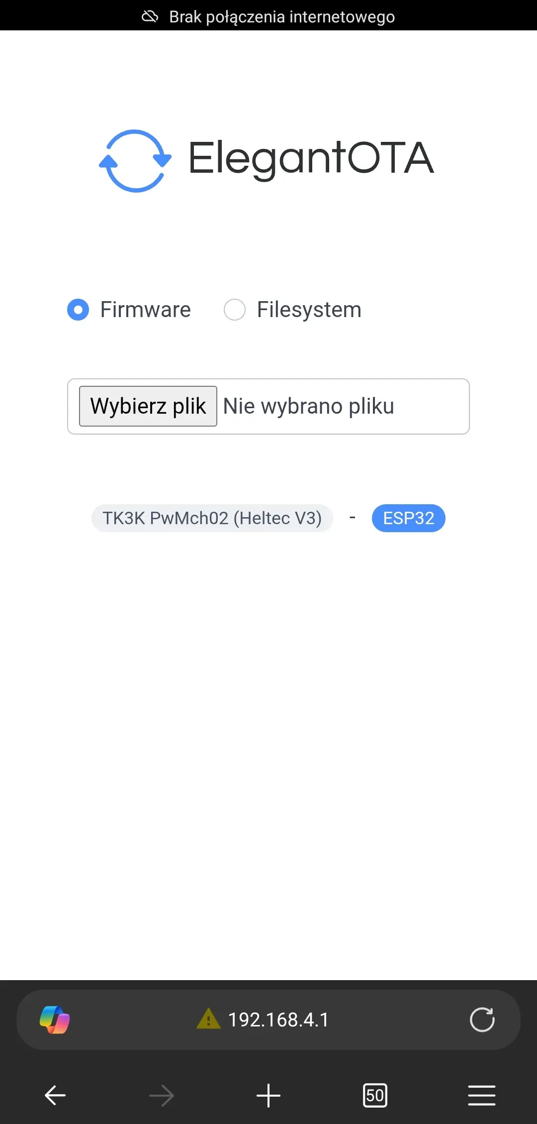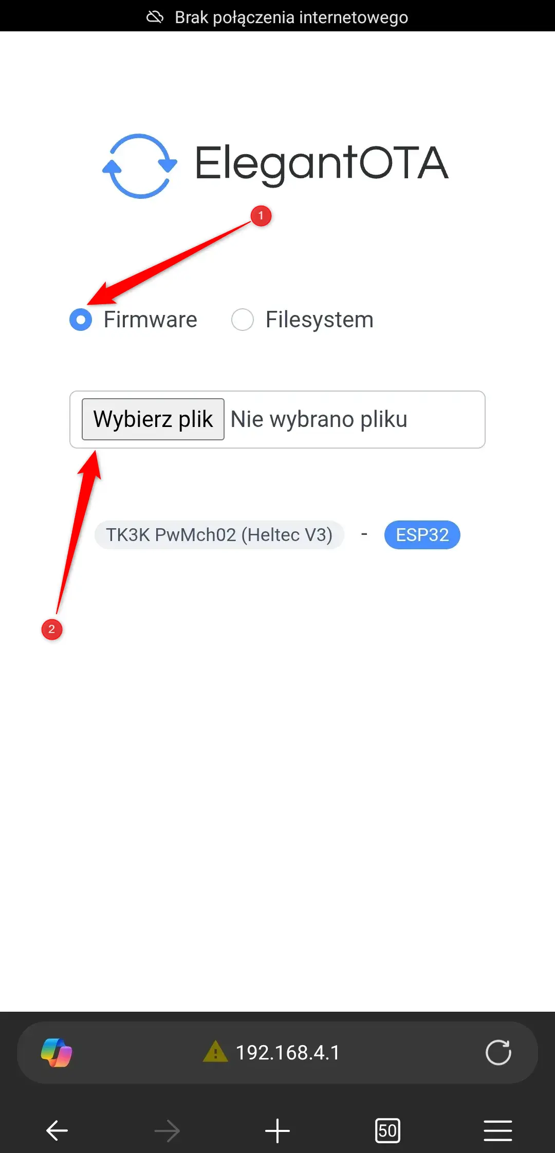 Zdarza się tak, że po wybraniu pliku nic się nie dzieje, tylko pokazuje się strona aktualizacji OTA. W takim przypadku najpierw odśwież stronę, a potem ponownie załaduj plik.