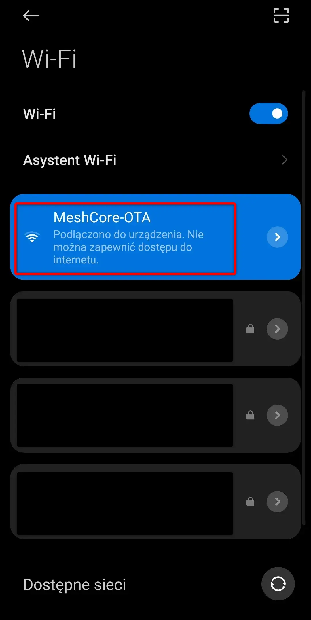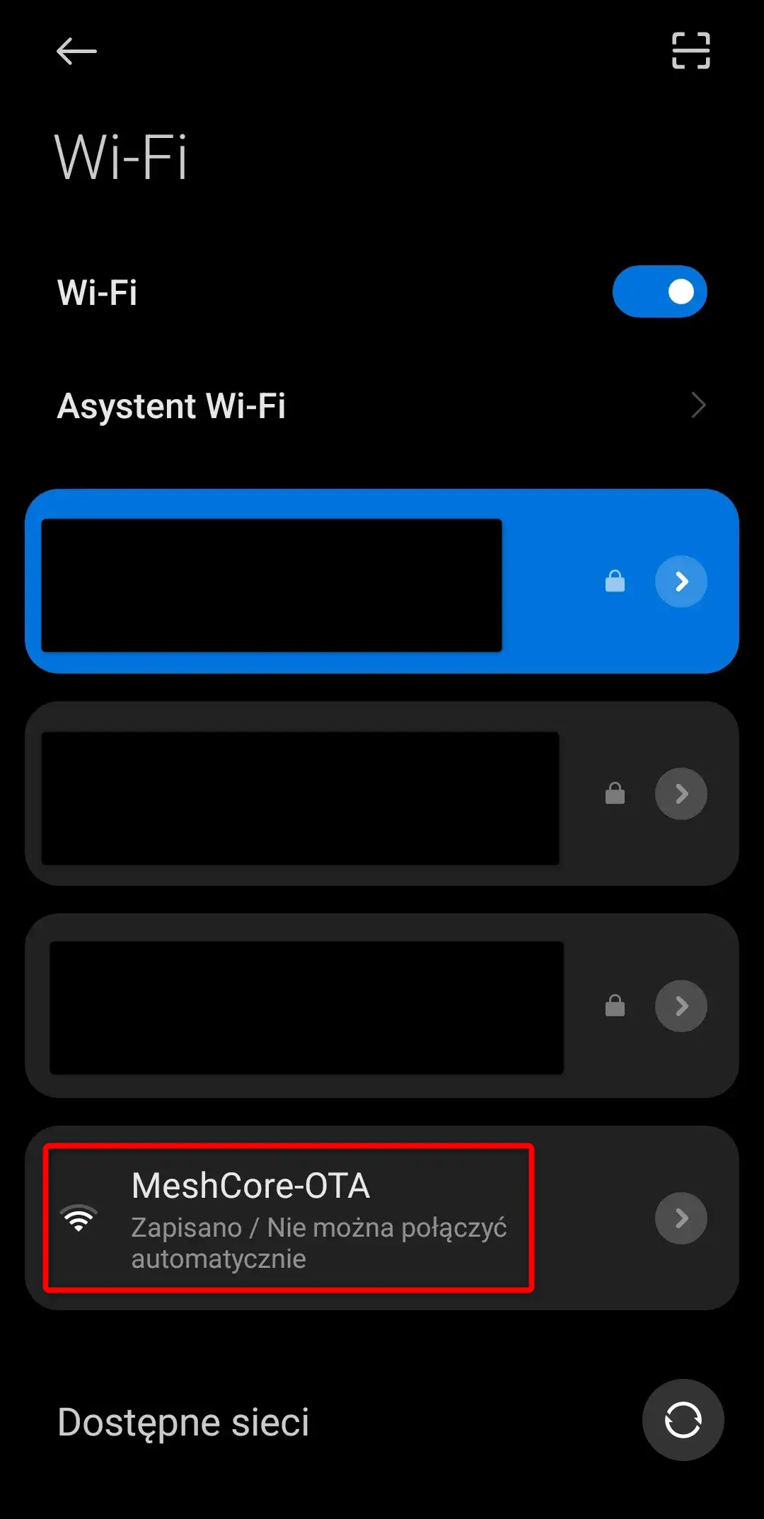 Wyjdź z aplikacji MeshCore i wejdź w połączenia Wi-Fi na telefonie. Będziesz widział taką sieć.