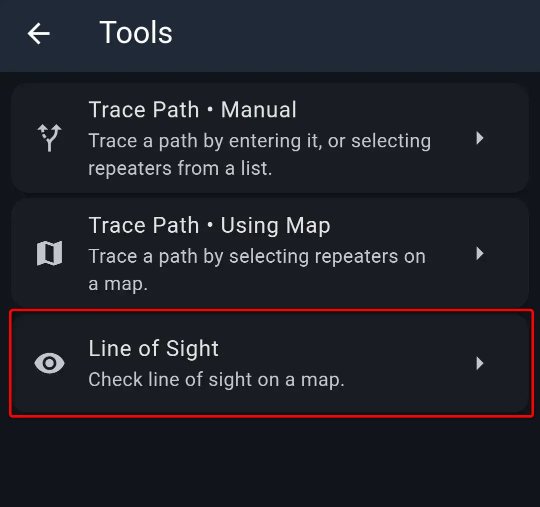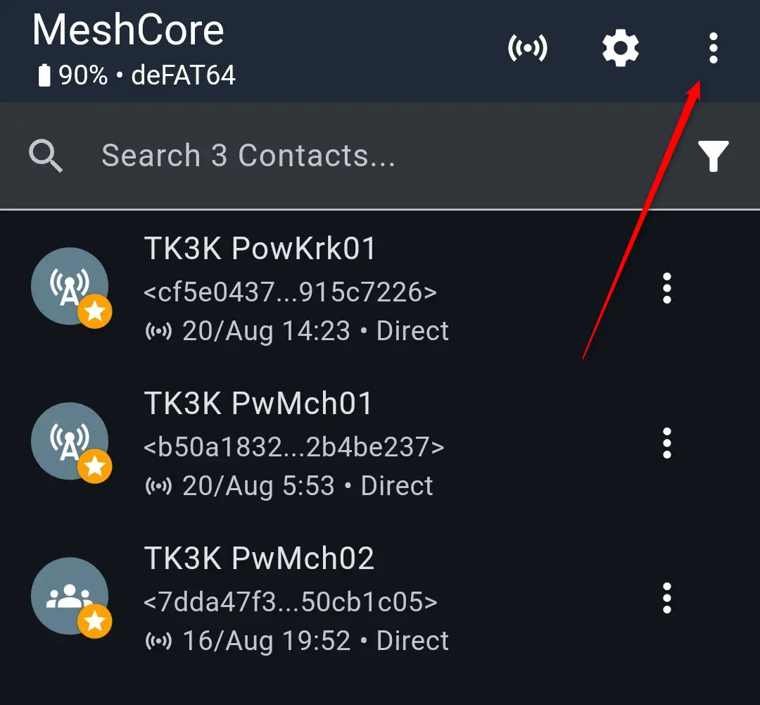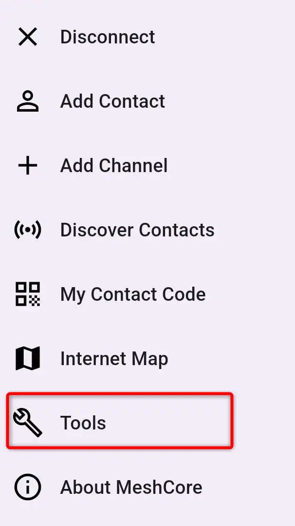 Uruchom aplikację MeshCore na telefonie, wybierz 3 kropki, a następnie Tools.