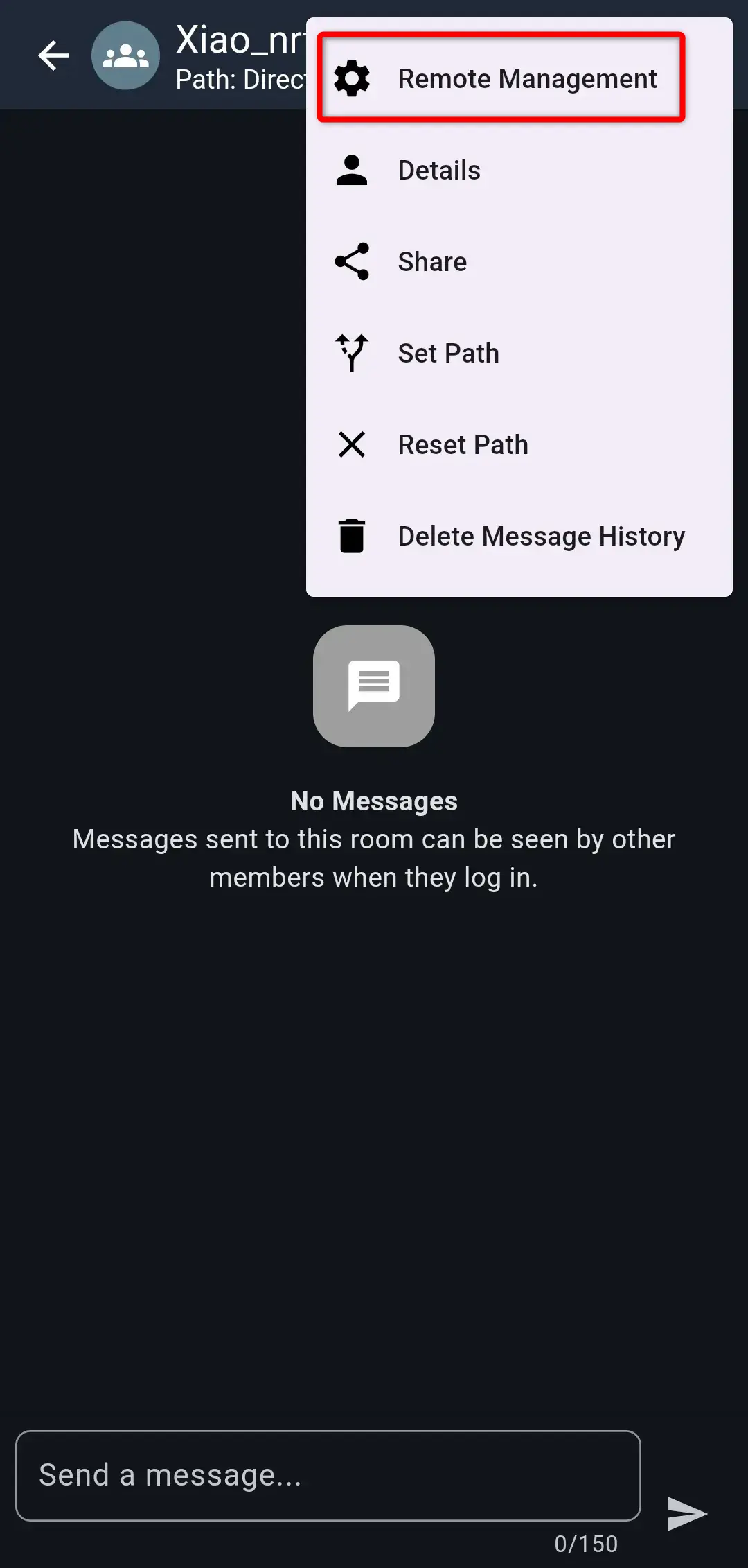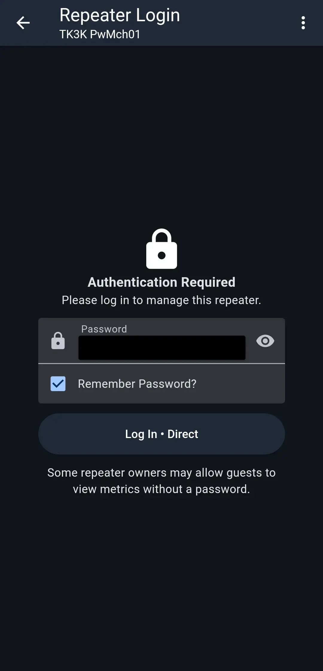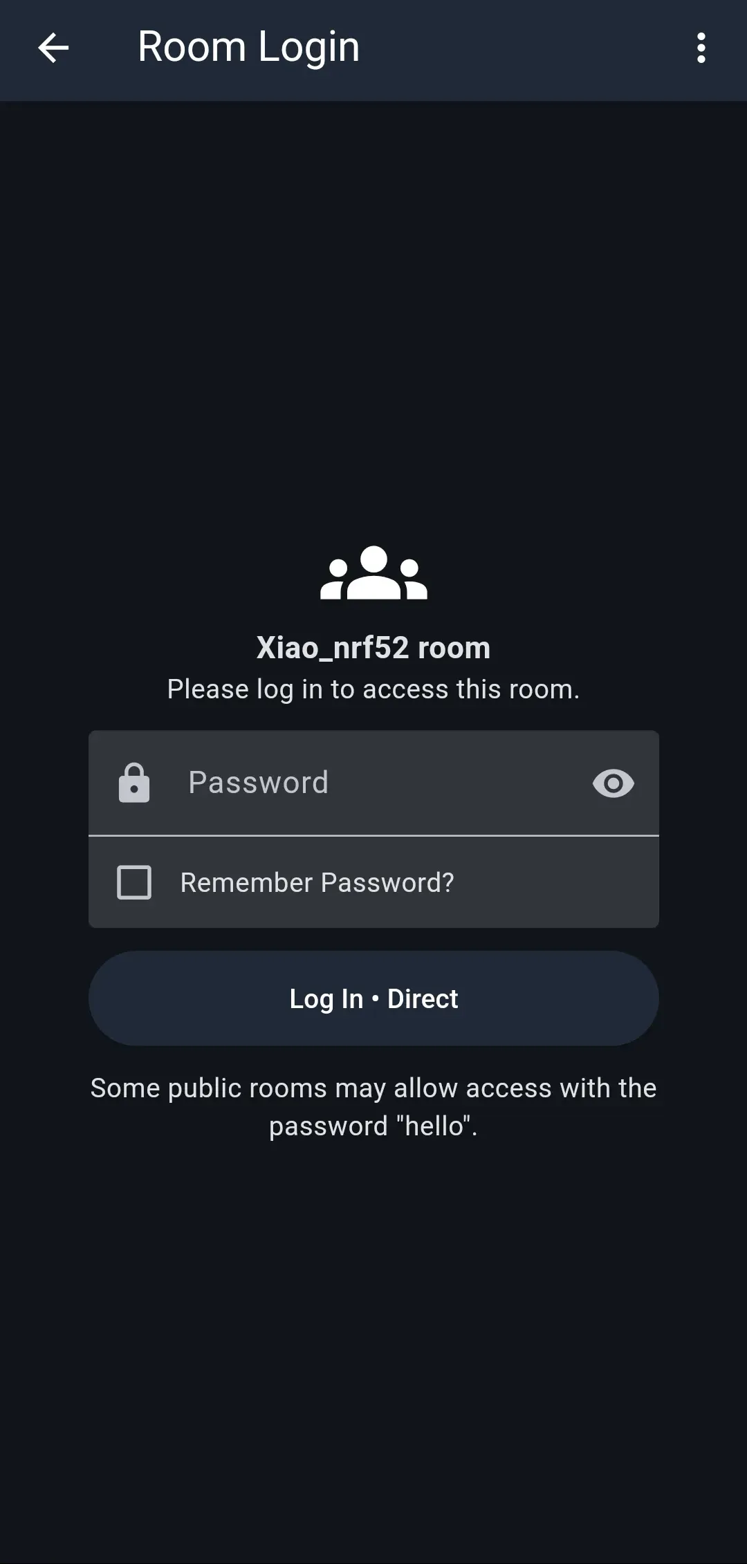 W MeshCore wybierz room server, na który chcesz się zalogować. Wpisz hasło i kliknij przycisk Log In. Jeśli zaznaczysz opcję Remeber Password? to po udanym zalogowaniu aplikacja zapamięta hasło.