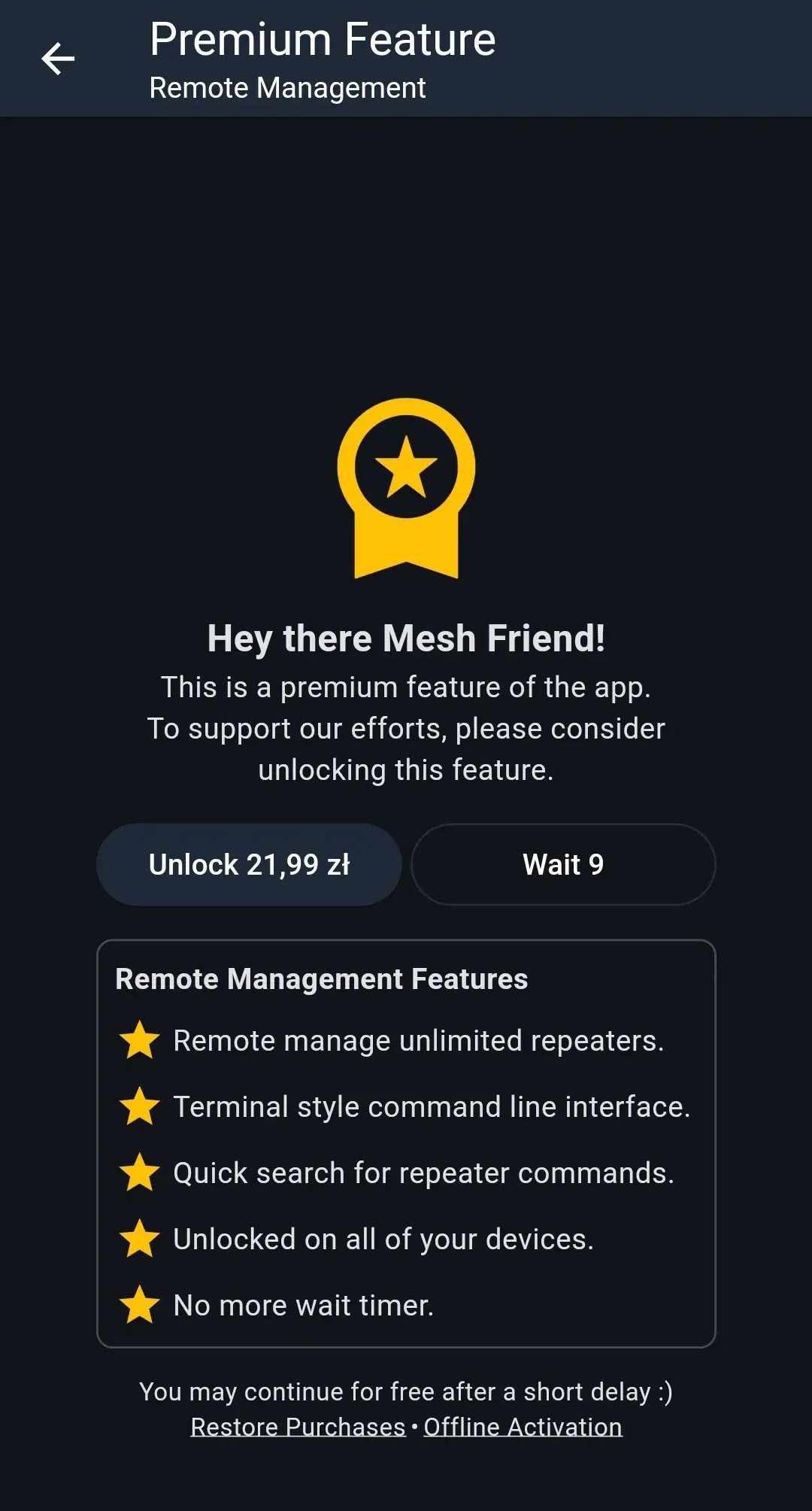W aplikacji MeshCore wybierz repeater, na który chcesz się zalogować. Jeśli nie posiadasz kupionej licencji, zobaczysz taki ekran:
